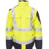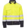 Zweifarbige Warnschutzjacke, Reflexstreifen, durchgehender, verdeckter Reißverschluss, im Kragen einrollbare Kapuze, elastische Taille